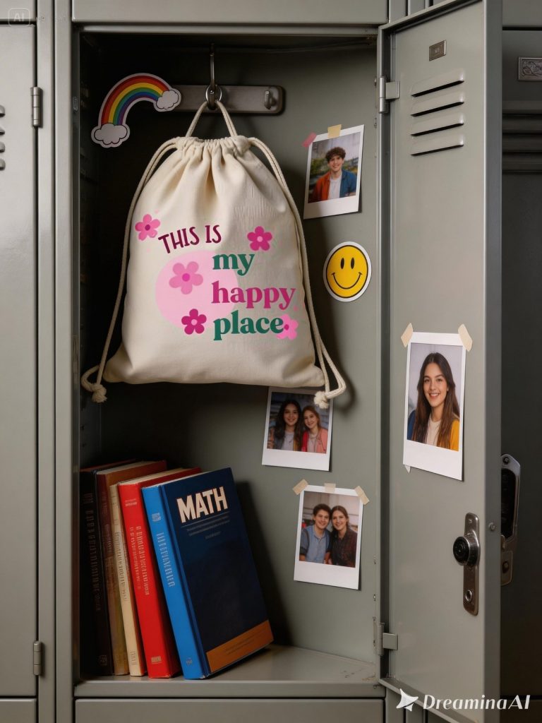 Tas serut berbahan kanvas dengan desain tulisan “This Is My Happy Place” yang dihiasi ilustrasi bunga berwarna cerah, memberikan kesan ceria dan menarik.